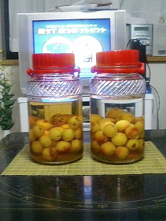 さて、こんなダイナミックに仕込むのは始めて。4リットル瓶を、これまた格安の1本500円でホームセンターで2本購入。左がお酢・蜂蜜・梅、右がホワイトリカー・蜂蜜・梅。お酢は1ヶ月後、お酒は3ヶ月後が楽しみ〜♪ どちらもロックでなんか飲めないし、1日どちらか1杯程度かと思うので長く楽しめそう。