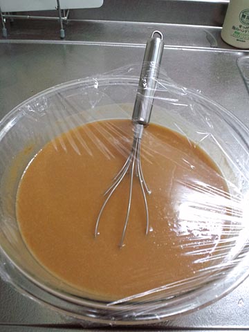 長袖とゴム手袋とエプロンして、マスクの代わりに鼻と口を手ぬぐいでおおって20分間絶え間なく泡立て器でガシャガシャしてたら、暑くて気分悪くなりました。うへぇっ(-△-;)