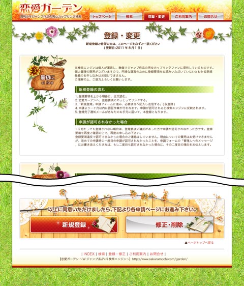 改装進行状況 (4)でアップした、登録・変更ページもあれから修正が入ったのですが、他のページを作り進めていくうちに「全体のバランスを取るためまた変更!!」とか出てくる可能性があるから、日記にアップ後に変更してももう差し替えないっ(多分・・・)