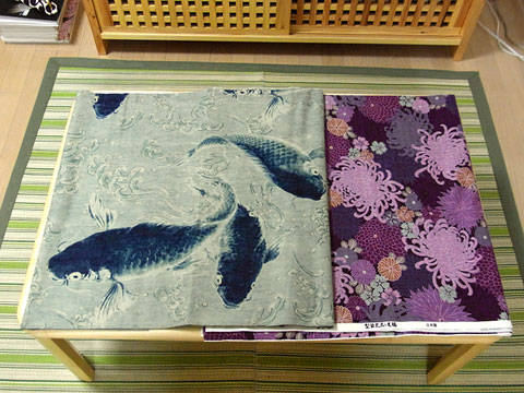 イスの紫色カバーは自分で作りました♪ お気に入りの和柄布です。夏場はい草の座布団も置いてます。い草ってひんやりして好き。